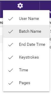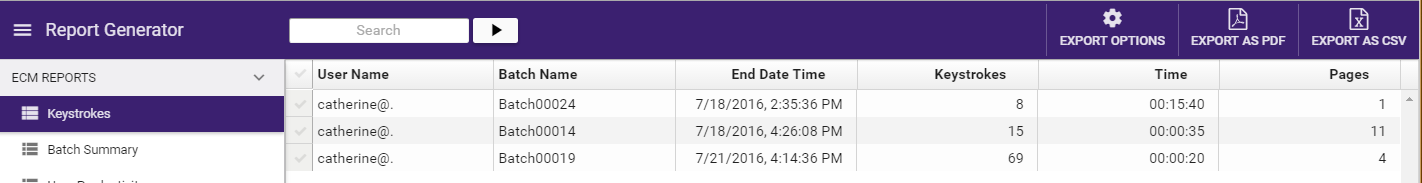 EXPORT OPTIONS - Filter the specific data that you want included in the report. If you de-select an option, that data will no longer appear in the report. The options available from the drop-down list will vary, depending on the report that you have generated. For example, with the Keystroke Tracking Report, you can choose the following: