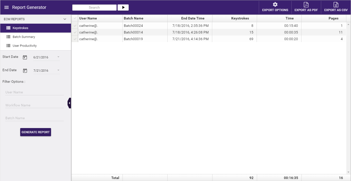 If necessary, enter a user name, workflow name, or batch name in the supplied fields to filter the report accordingly.