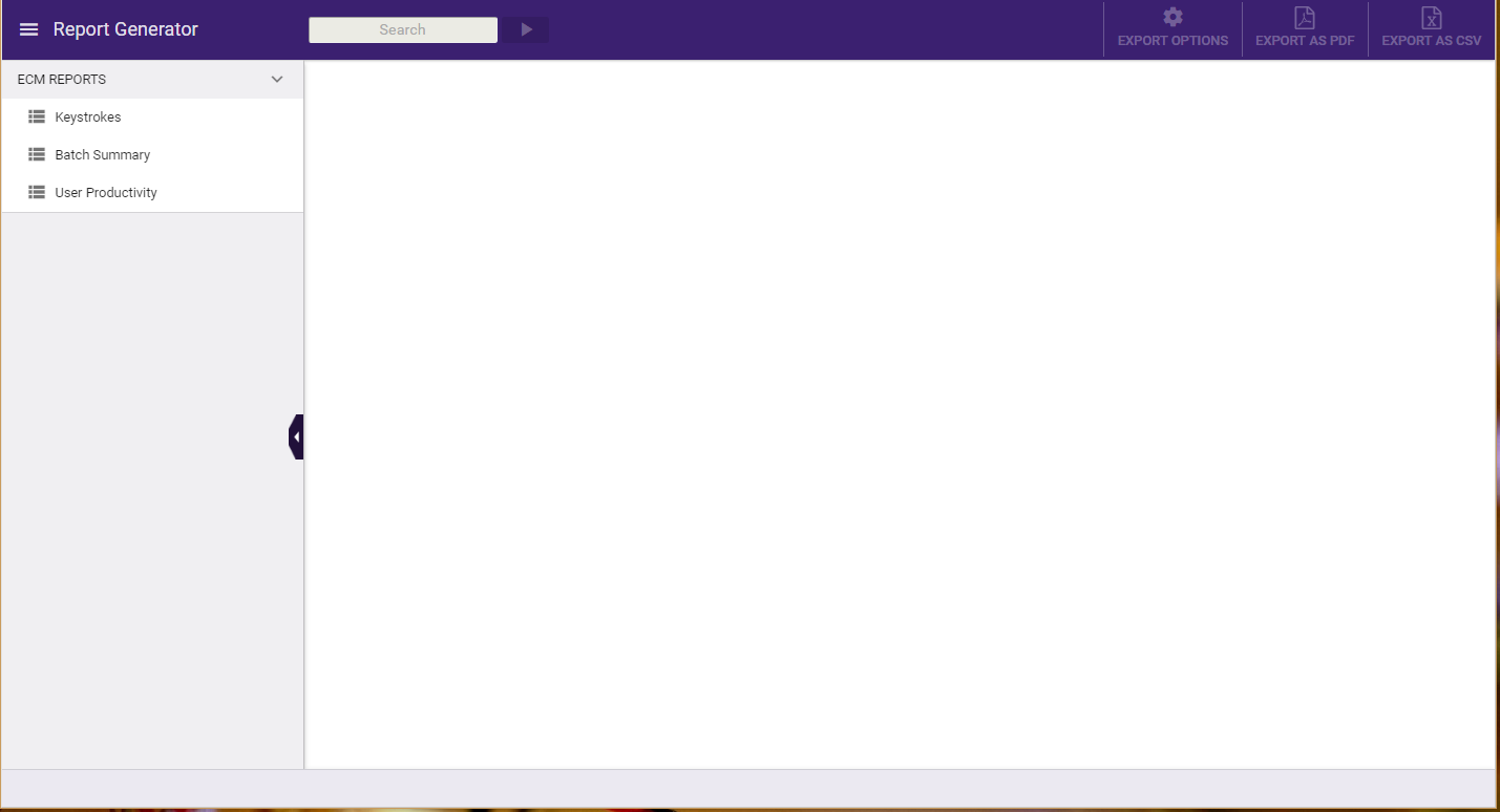 When you first access ECM Reports on DP Web, the Report Generator Tool will appear, listing all the types of reports that can be generated on the left-hand side of the page, as in the following illustration: